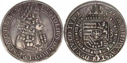 Tolar 1699, Tyroly Hall jako Voglh. 221/VII opis: ARCHIDVX: AVST - :DVX: BV: CO: TYR: 28,285 g