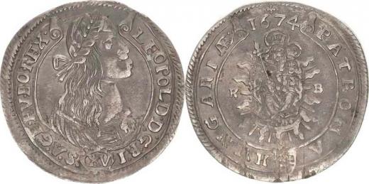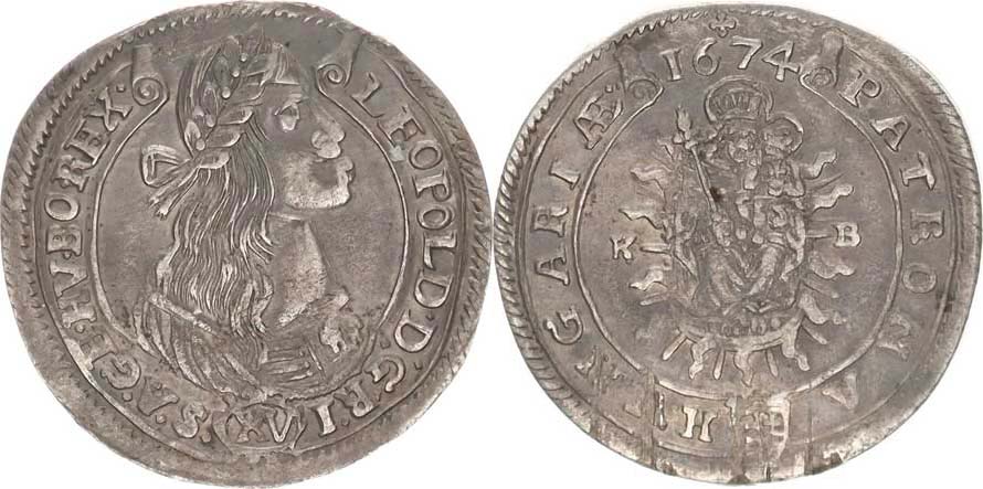 XV kr. 1674 KB Hol.74/1,2 var. nad Madonou křížek, nad zn ačkou dva plameny "R"