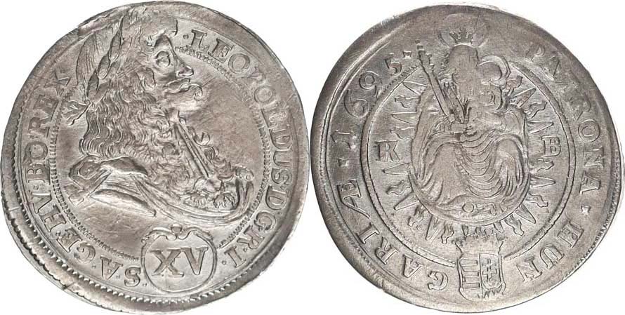 XV kr. 1695 KB Hol.95.1,3 var. A _mělčí ražba Rv., dr. vada stř.