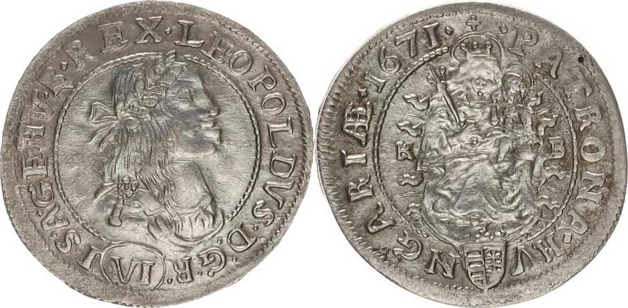 VI kr. 1671 KB - na rameni květinka, před PATRONA a za datací teč ka, nominál ve velkém kroužku 2,925 g