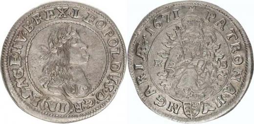 VI kr. 1671 KB - na rameni květinka, před PATRONA a za datací teč ka, nominál ve velkém kroužku 2,925 g