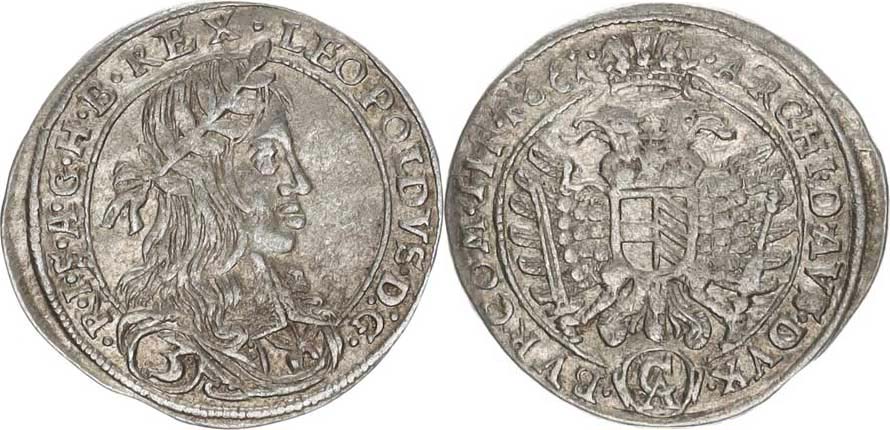 3 kr. 1661 CA, Vídeň-Cetto var.: velké poprsí rozděluje opis LEOPOLDVS.D:G.(3).R.I.S.A.G.H.B.REX. / nedělená datace před korun ou, opis: .ARCHID.AVS.DVX() .BVR.COM.TIR.1661. "R"