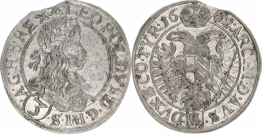 3 kr. 1662 CA, Vídeň-Cetto var.: v Av. perlovcový a hladký kruh, nad hlavou arabeska, opis: LEOPOLDVS.D.G.R.I.S. () . A.G.H.B.REX / datace dělená korunou 16-62 opis: ARCHI. D. AVS. () . DVX. B.CO . TYR. "RR"_mír. kraj. střížek