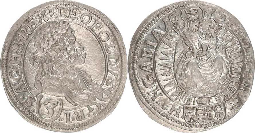 3 kr. 1675 CC, Bratislava-Cetto jako Husz. 1476, opis: D.G. R.I. - .S.A...... "sbíkrovvý stav"