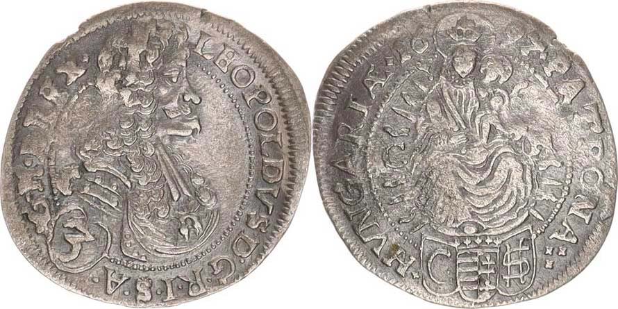 3 kr. 1697 CH/CSH, Bratislava-Hunger jako Husz. 1478, jiné zdo bení pláště, opis. R.I.S.A. () . G. / za PATRONA trojtečka !