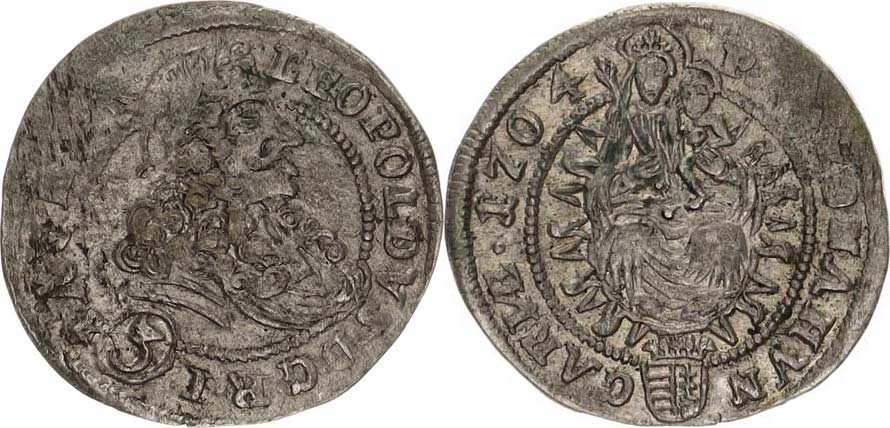 3 kr. 1704 b.zn. (neznámá mincovna), uherský typ - Madona Novotný 16 (T.C.),; Husz. 1461; Monten. 1008; "RR" 1,464 g_mír. nedor., tém.