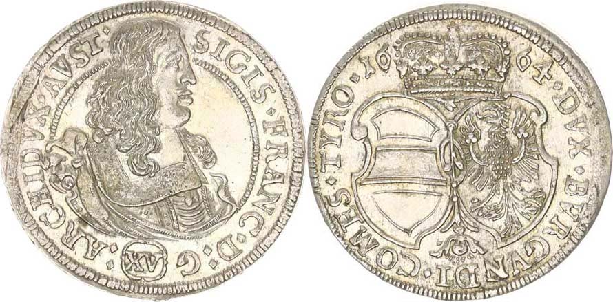 XV kr. 1664, Tyroly, Hall var.: D: G () :ARCHIDVX. AVST. 6,66 g
