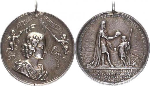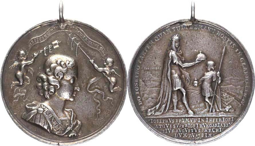 Korunovační medaile na uherského krále v Bratislavě 9.12. 1687, A: Chlapecký portrét Josefa I. zprava, po stranách dva andělé, op is / Leopold I. vkláda Josefovi I. na hlavu korunu sign.: GH / LGL Ag 45 mm 38,46 g Novák X/A/10/b; Mont. 1197 dobové ouško