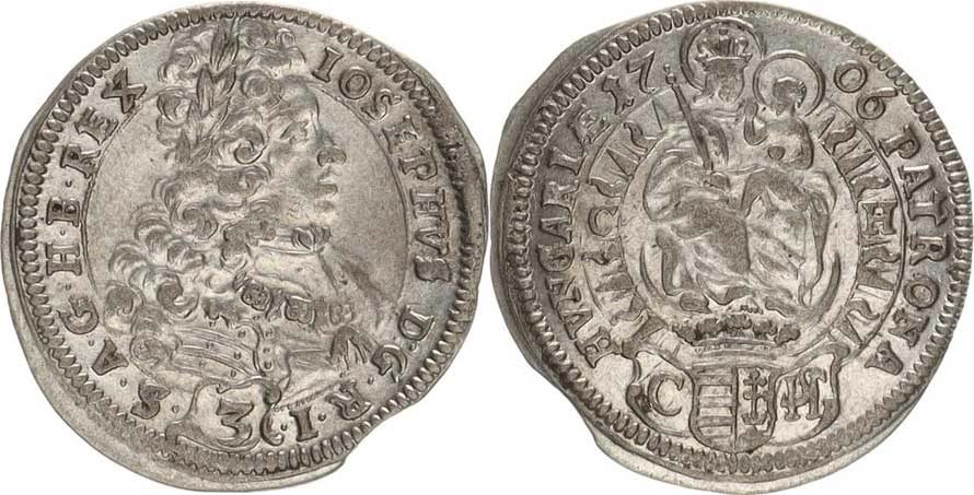 3 kr. 1706 C-H / C HS, Bratislava-Hunger Husz. 1577 var. kres by a opisu: IOSEPHVS D:G.R.I. () .S.A.G.H.B.REX / bez rozděl. z namének "RR" 1,64 g